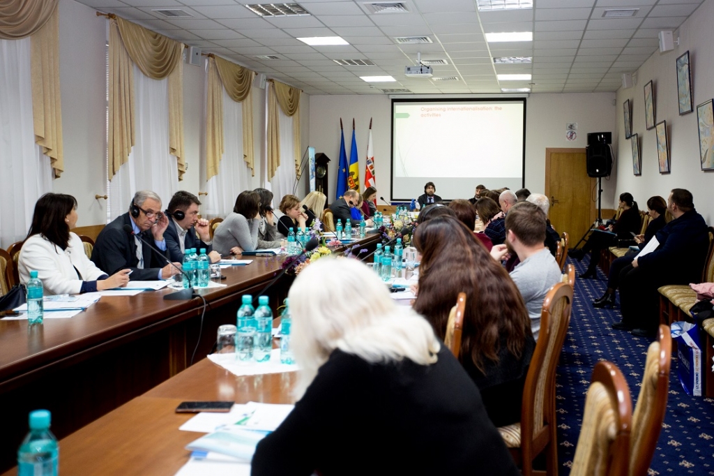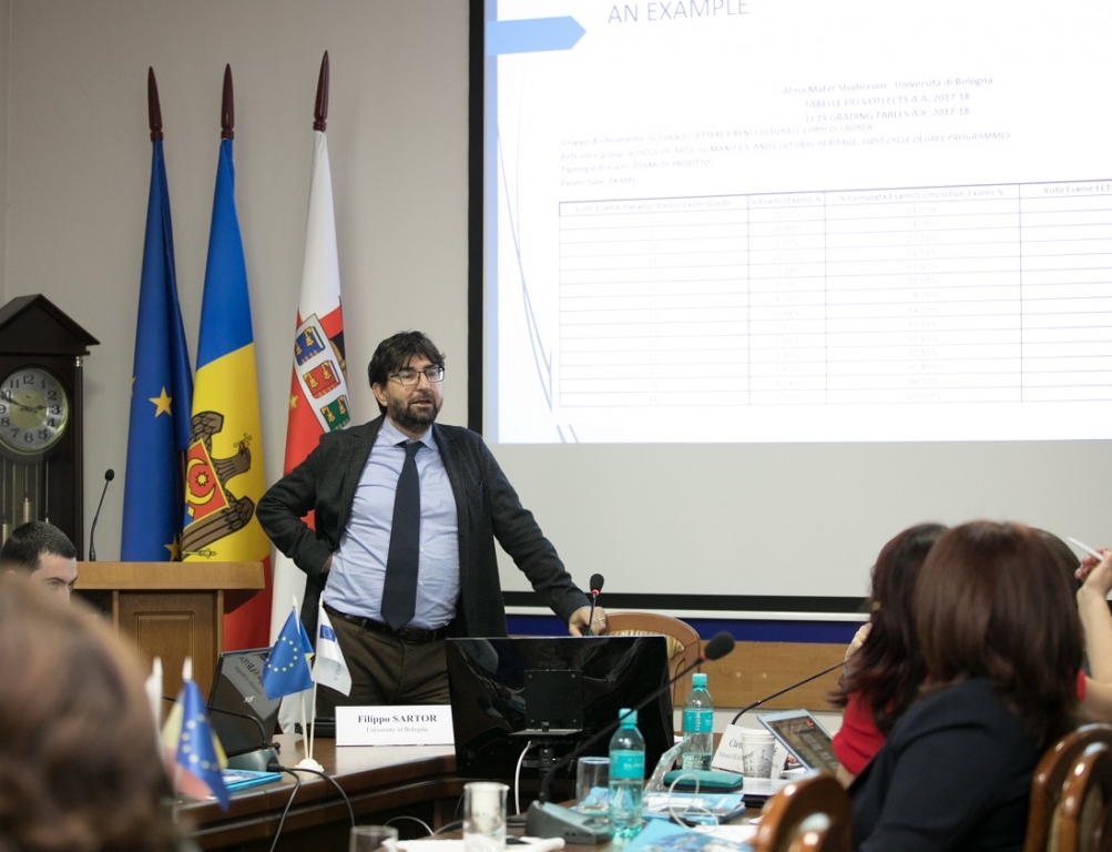 The informative-applicative session has been moderated by Dr. Filippo Sartor, Head of the International Professional Projects and Cooperation Development at extra-European level Department, University of Bologna, Italy. The dialogue was focused on the importance of the international relations for the HEIs, organisation of the international academic mobilities in European and Moldovan HEIs, the role of the mobilities in the internationalisation of the education system and credits and marks recognition methodologies, being offered the example of some Italian, Spanish and French HEIs.