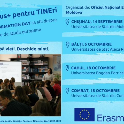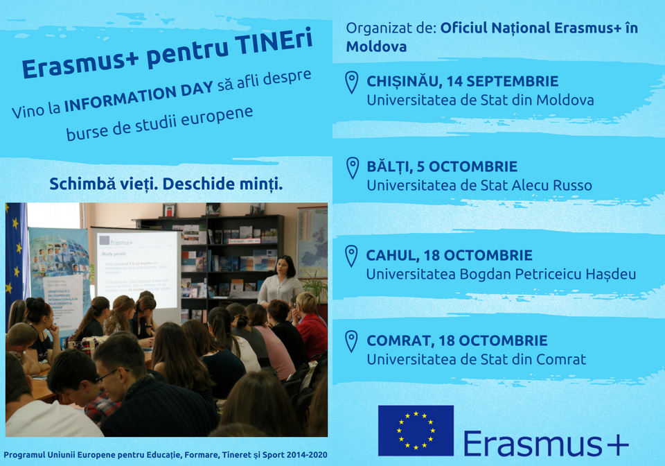 Students from the Moldovan universities and also the young people owning a License diploma, that are interested in European Studies, will have the possibility to find out the opportunities offered by the Erasmus+ Programme in the field of high education. This will be accomplished during the informational campaign hold by National Erasmus+ Office in the Republic of Moldova.