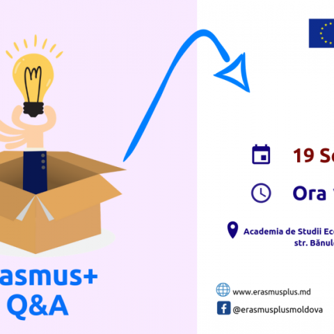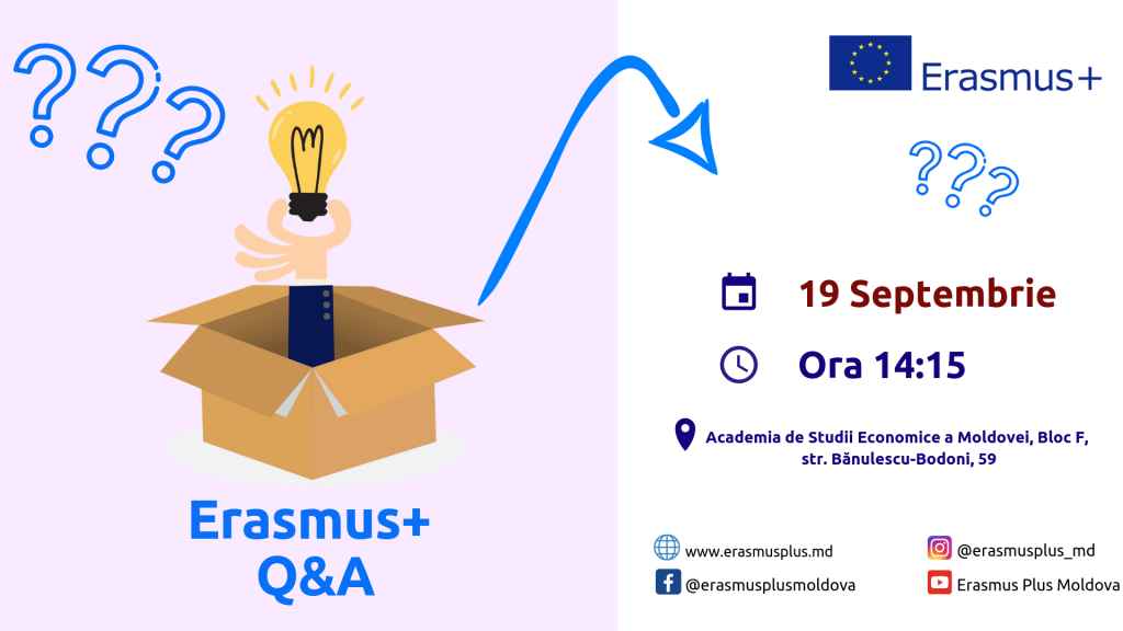 Primul eveniment din seria „Erasmus+ Q&A” va fi organizat la Academia de Studii Economice din Chișinău (Bloc F, str. G. Bănulescu-Bodoni, 59). Formatul acestui eveniment presupune o sesiune de întrebări și răspunsuri pentru studenții din Chișinău, interesați de bursele oferite de Programul Erasmus+.