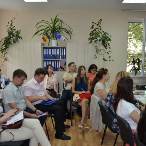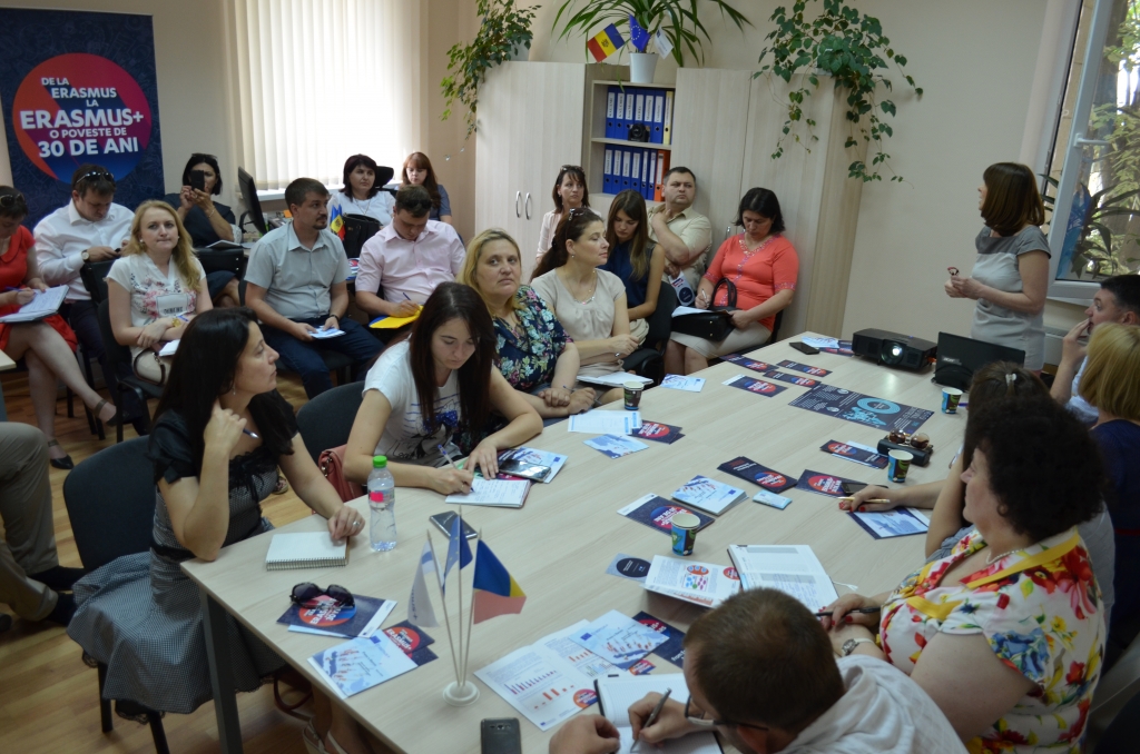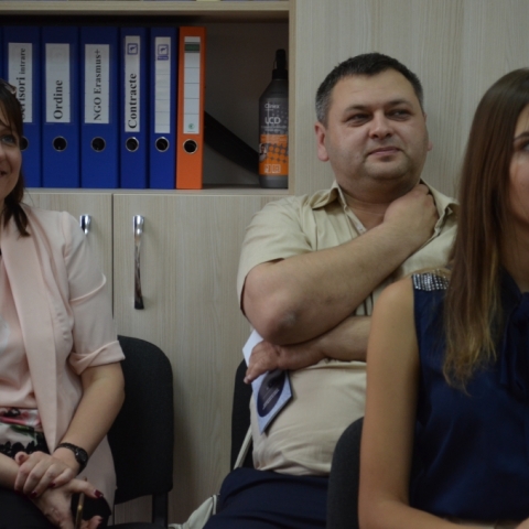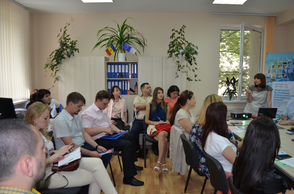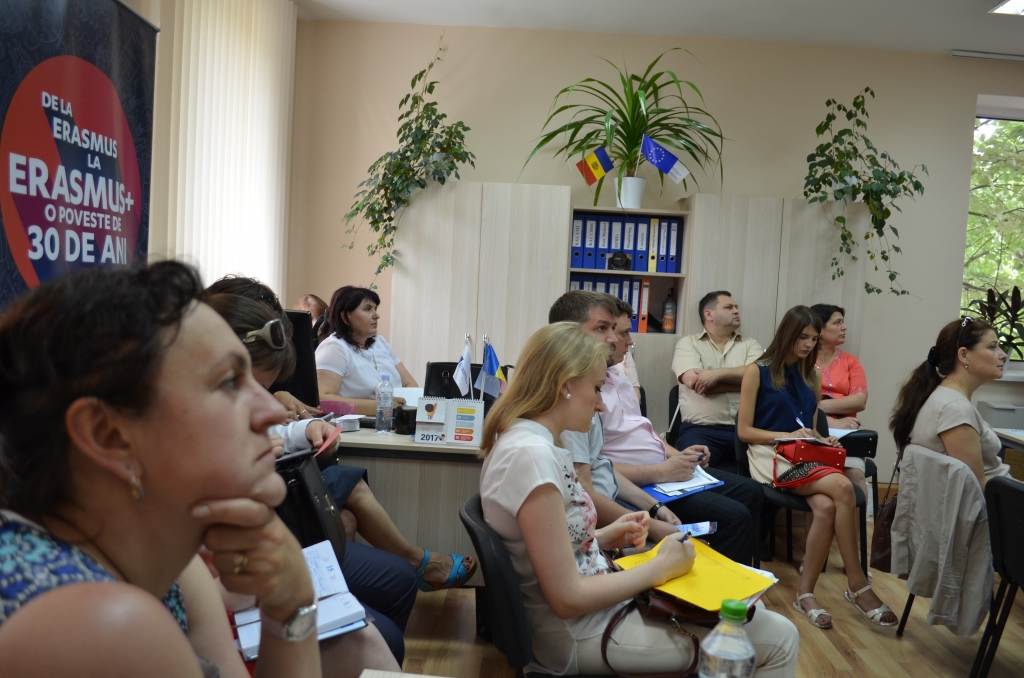 Claudia Melinte, coordonatorul Oficiului Erasmus+, a prezentat programul Uniunii Europene și le-a vorbit participanților despre toate acțiunile cheie implementate în Republica Moldova la care pot participa instituțiile de învățământ superior de la noi. Claudia Melinte s-a referit la posibilitățile instituțiilor din Moldova și a cadrelor universitare de a identifica parteneriate cu universități din țări membre ale Uniunii Europene, modalitățile de aplicare la proiecte de mobilitate pentru profesori și studenți, dar și mecanismul de elaborare a proiectelor.